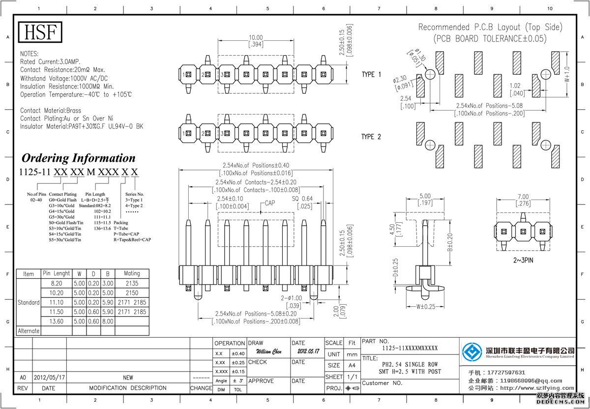 產品介紹:額定電流:3.0amp電流電阻:20mΩ最大絕緣電阻:1000mΩ民承受電壓:AC 500V /分鐘工作溫度:40﹣℃+ 105℃接觸材料:黃銅觸點電鍍金或錫鎳絕緣體材質:聚酯(UL94V-0)標準:PA9T或PBT黑色+ 30% GF