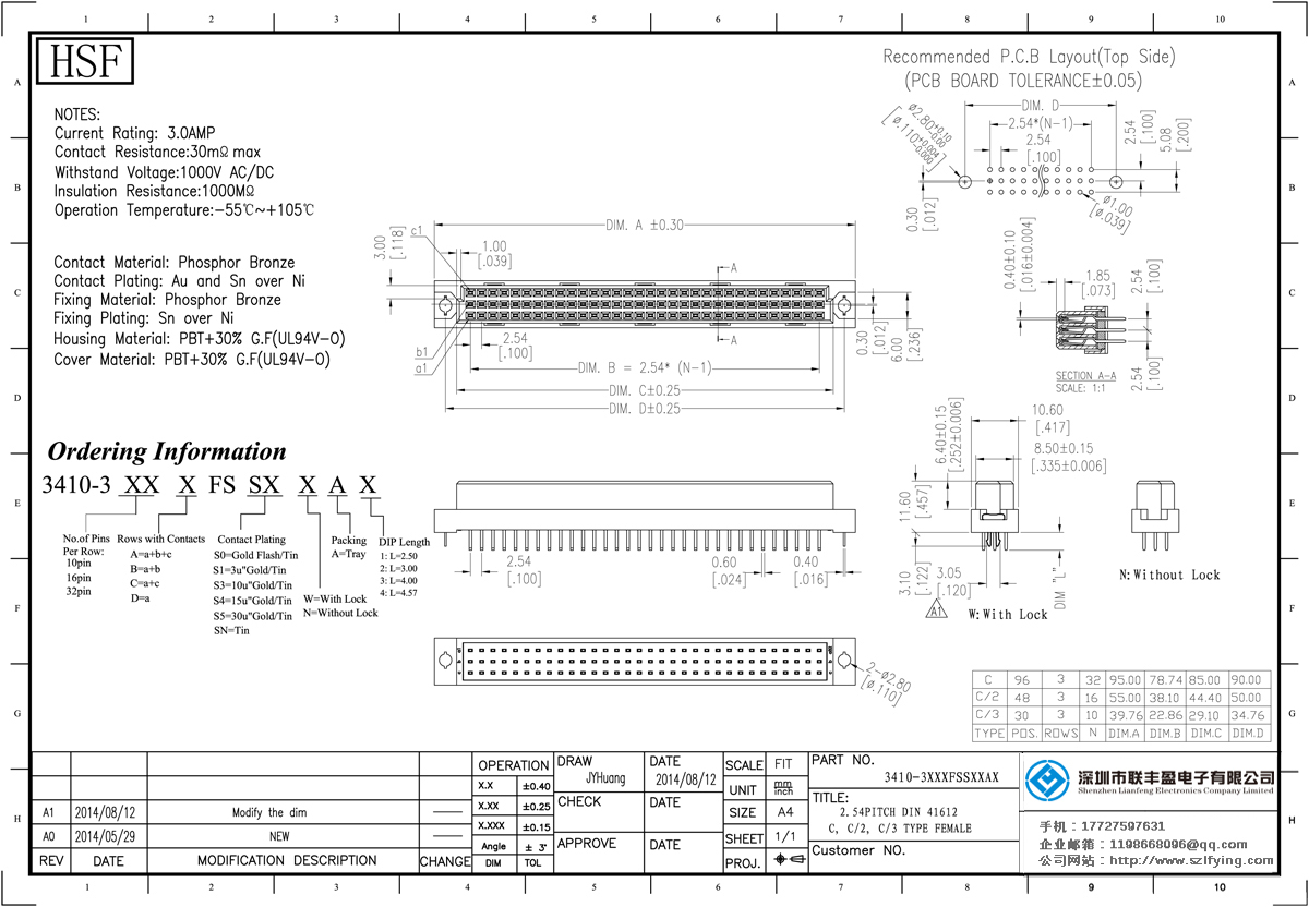 產品分類:DIN 41612連接器 產品型號:HF DIN41612 母座 3*16P 180直插型 板對板連接 供應 技術參數:額定電流:3.0amp電流電阻:30m最大耐壓:1000V的交流/直流絕緣電阻:1000分鐘操作溫度: