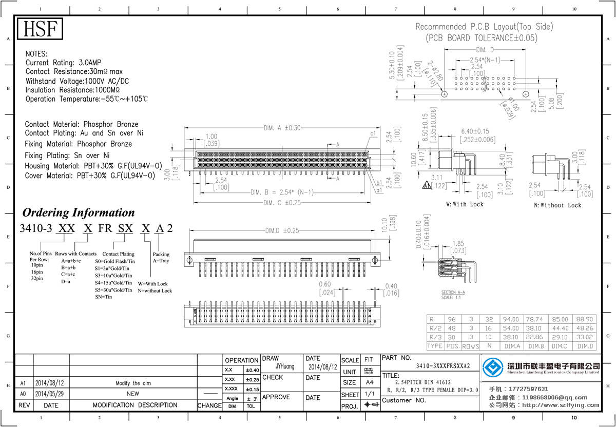 技術參數:額定電流:3.0amp電流電阻:30mΩ最大耐壓:1000V的交流/直流絕緣電阻:1000分鐘操作溫度:55﹣℃+ 105℃接觸材料:銅觸點電鍍金或錫鎳絕緣體材質:聚酯(UL94V-O)標準:PBT的+ 30%