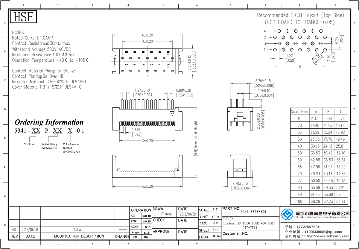 技術參數:額定電流:1.0amp電流電阻:30mΩ最大耐壓:1000V的交流/直流絕緣電阻:1000分鐘操作溫度:55﹣℃+ 105℃接觸材料:銅觸點電鍍金或錫鎳絕緣體材質:PBT的+ 30% g.f UL94V-O