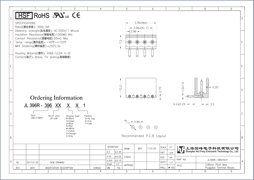 詳細型號:插拔式接線端子-JL396R,間距3.96mm,CE認證,UL證書
