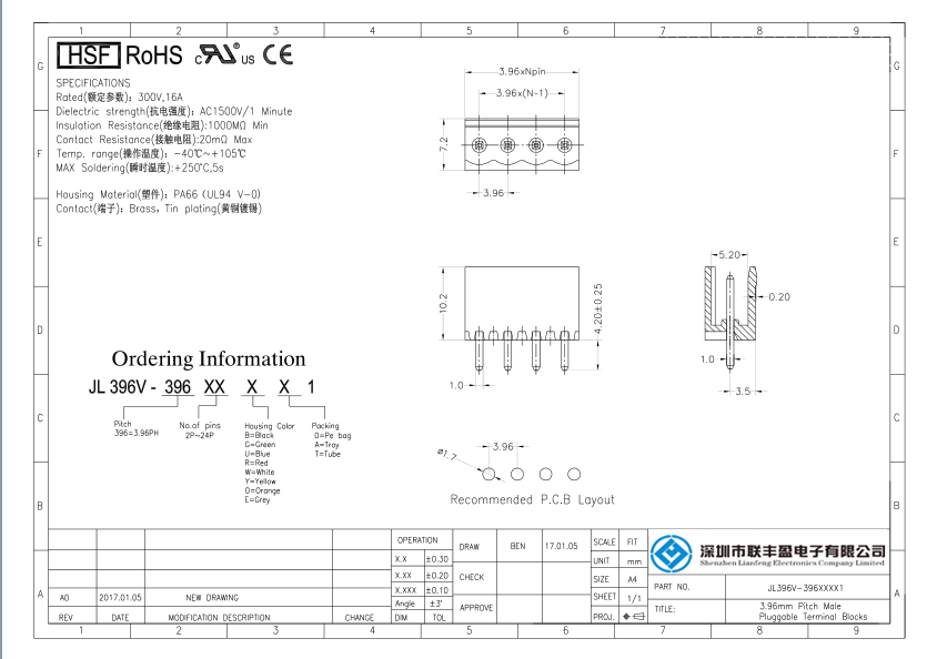產(chǎn)品分類:接線端子 產(chǎn)品型號(hào):插拔式接線端子-JL396V,間距3.96mm 詳細(xì)型號(hào):插拔式接線端子-JL396V,間距3.96mm,CE認(rèn)證,UL證書(shū) 產(chǎn)品介紹:材質(zhì)電鍍(MATERIAL) , 螺絲(Screw)M2.0,鋼,鍍鋅