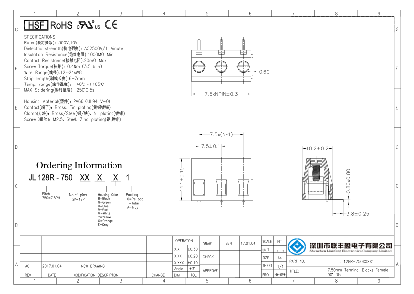 產品分類:接線端子 產品型號:PCB接線端子 間距5.00/5.08/7.50mm 產品介紹:材質電鍍(MATERIAL) , 螺絲(Screw)M2.0,鋼,鍍鋅Steel,Zinc Plated 彈片(Reed)黃銅,鍍鎳Brass,Ni plated 焊針(Pi
