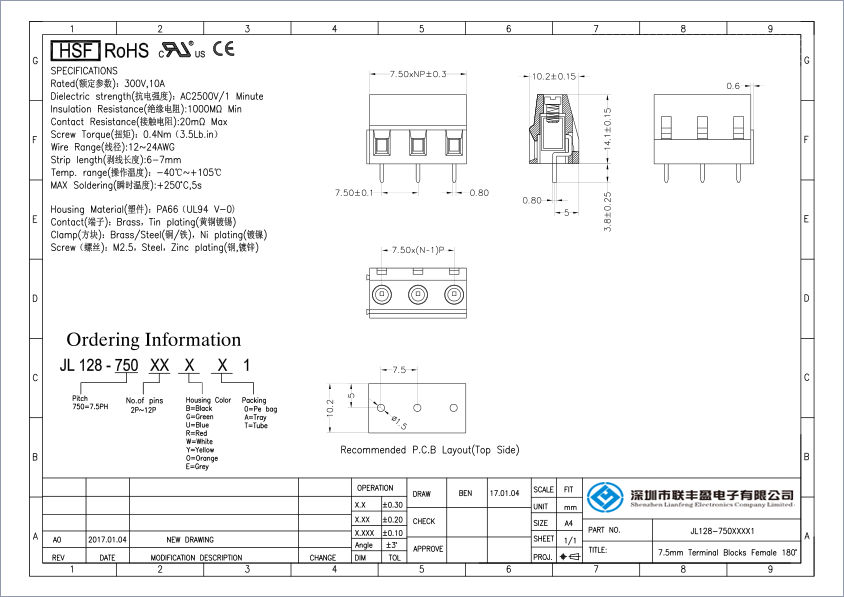 產(chǎn)品分類: 接線端子 產(chǎn)品型號(hào):螺釘式PCB接線端子 間距5.00/5.08/7.50mm 聯(lián)豐盈 產(chǎn)品介紹:材質(zhì)電鍍(MATERIAL) , 螺絲(Screw)M2.0,鋼,鍍鋅Steel,Zinc Plated 彈片(Reed)黃銅,鍍鎳Brass,N