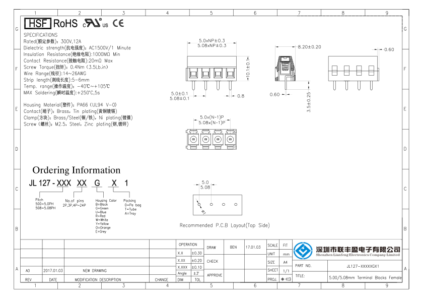 產品分類:接線端子 產品型號:螺釘式PCB接線端子-127,間距5.00/5.08mm, 產品介紹:材質電鍍(MATERIAL) , 螺絲(Screw)M2.0,鋼,鍍鋅Steel,Zinc Plated 彈片(Reed)黃銅,鍍鎳Brass,Ni plate
