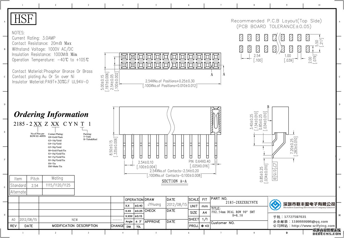 產品分類:排母連接器 產品規格:2.54MM H=7.1MM 上插式 2*7P 雙排 180 SMT 排母 聯豐盈 產品介紹:額定電流:3.0amp電流電阻:20m最大絕緣電阻:1000mmin耐壓:1000V AC /分鐘工作溫度:40﹣℃+