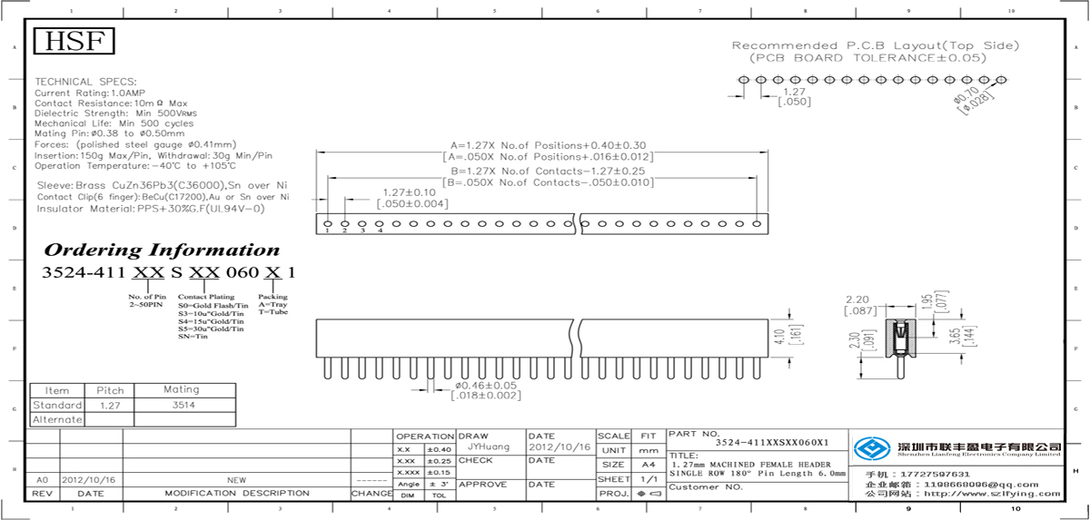 產品分類:圓孔排針排母連接器 產品型號:聯豐盈 1.27MM 單排 10P 直插 塑膠高度4.1 圓孔排母連接器 技術參數:額定電流:1.0amp接觸電阻:10m0 Max Dielectric強度:MIN 500vrm5機械壽命:最少