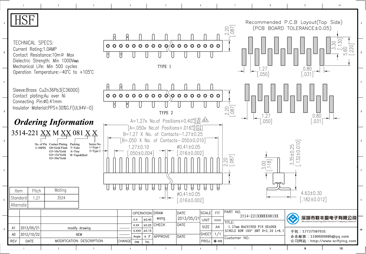 產(chǎn)品分類:圓孔排針排母連接器 產(chǎn)品型號(hào):聯(lián)豐盈1.27MM H=2.2 單排 180 SMT 圓型排針 技術(shù)參數(shù):額定電流:1.0amp接觸電阻:10m0 Max Dielectric強(qiáng)度:MIN 500vrm5機(jī)械壽命:最少500次交配銷:0.380