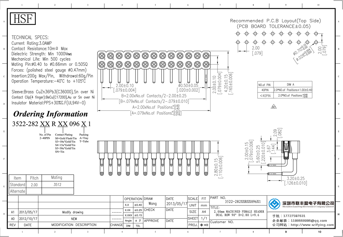 產品分類:圓孔排針排母連接器 產品型號:聯豐盈 2.0MM 雙排 R/A 圓孔排母 技術參數:額定電流:3.oamp接觸電阻:1om最大介電強度:MIN 1000vrms機械壽命:最少500次交配引腳:0.400.66mm或0.