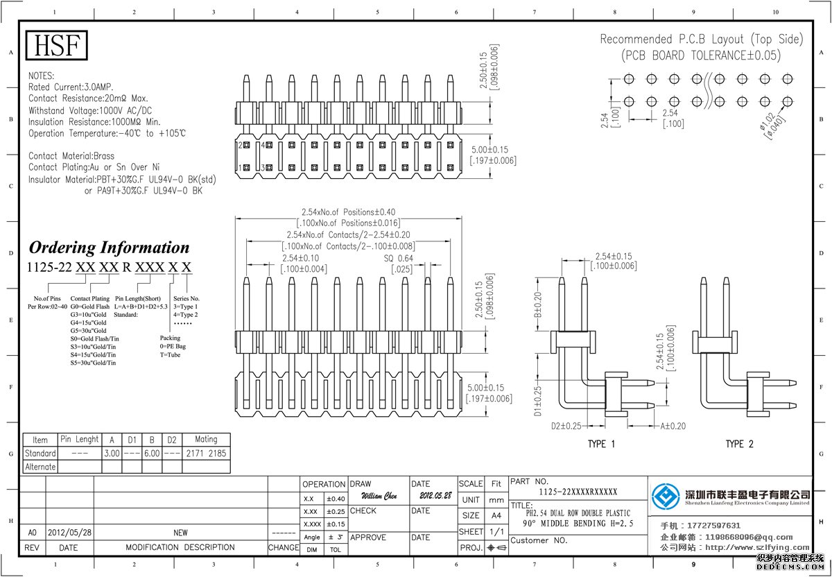 技術參數:額定電流:3.0amp電流電阻:20mΩ最大絕緣電阻:1000mΩ承受電壓:AC 500V /分鐘工作溫度:40﹣℃+ 105℃接觸材料:黃銅觸點電鍍金或錫鎳絕緣體材質:聚酯(UL94V-0)標準:PA9T或PBT黑色+ 30% GF