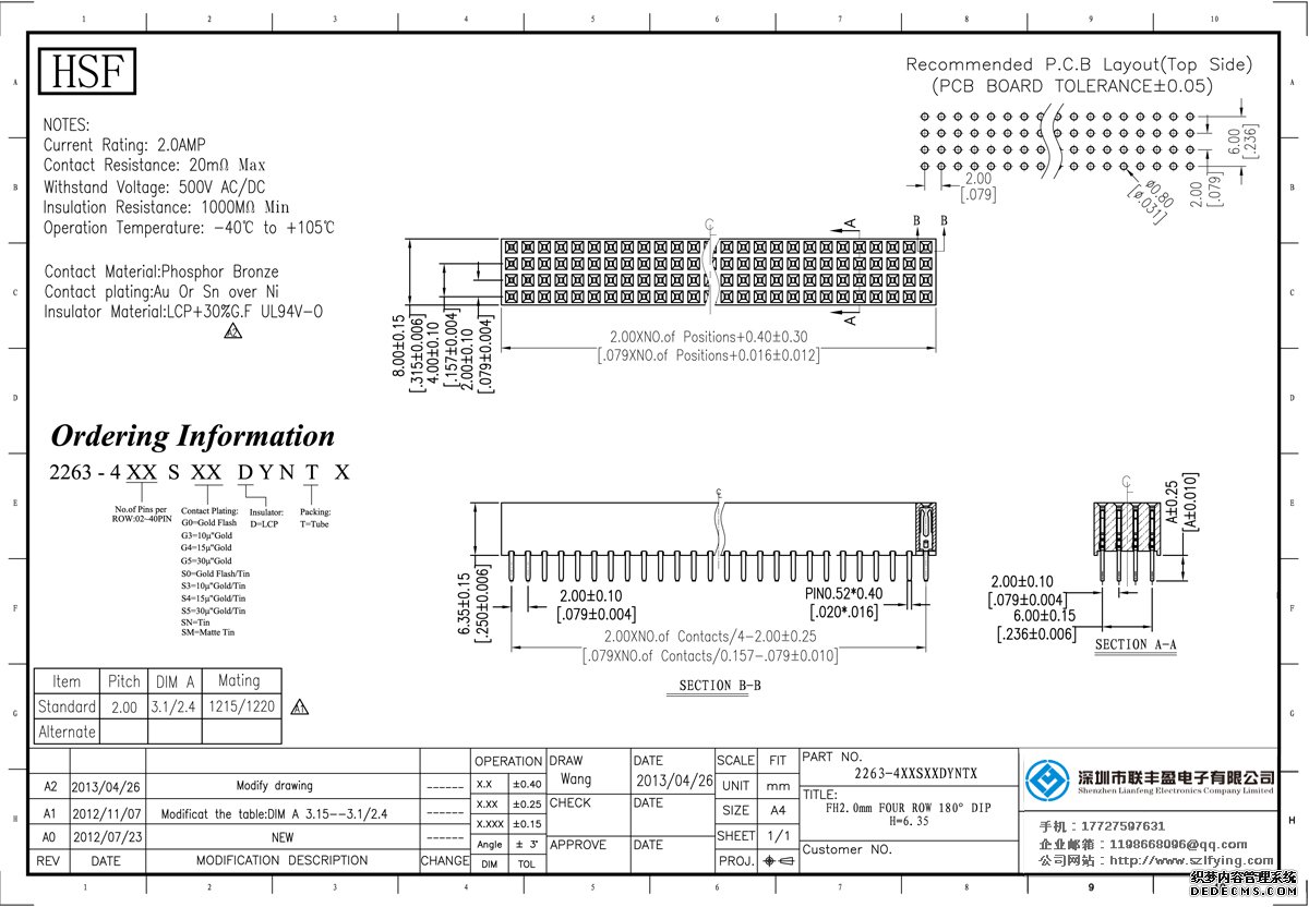 產品介紹:額定電流:2.0amp電流電阻:20mΩ最大絕緣電阻:1000mΩ民承受電壓:AC 500V /分鐘工作溫度:55﹣℃+ 125℃接觸材料:磷青銅接觸電鍍:對鎳金絕緣體材料:聚酯(UL94V-O)標準:LCP PA6T黑+ 30% GF HTPP/www.huifng-china.com