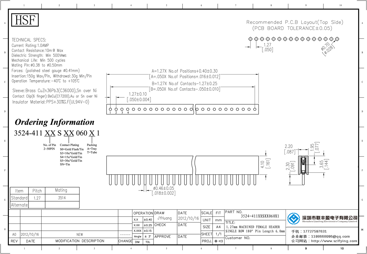 產品分類:圓孔排針排母連接器 產品型號:聯豐盈 1.27MM 單排 直插型 圓孔排母 廠家 技術參數:額定電流:1.0amp接觸電阻:10m0 Max Dielectric強度:MIN 500vrm5機械壽命:最少500次交配銷:0