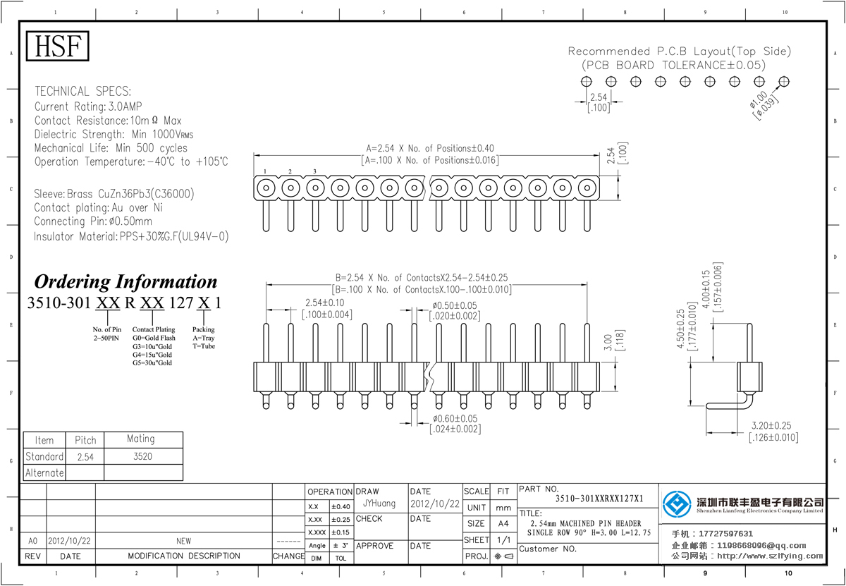技術參數:額定電流:3.oamp接觸電阻:1omΩ最大介電強度:MIN 1000vrms機械壽命:最少500次交配φ引腳:0.7φ0.9mm或0.635sq力量:(拋光不銹鋼表φ0.76mm)插入:150g最大/銷,退出:30g分鐘/銷操作溫度:40℃+ 105℃套:黃銅cuzn36pb3(c36000)接觸CIIP.
