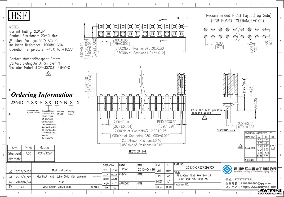 產品分類:排母連接器 產品規格:聯豐盈 2.0MM 雙排加塑膠 180SMT 排母 生產 產品介紹:額定電流:2.0amp電流電阻:20m最大絕緣電阻:1000m民承受電壓:AC 500V /分鐘工作溫度:55﹣℃+ 125℃