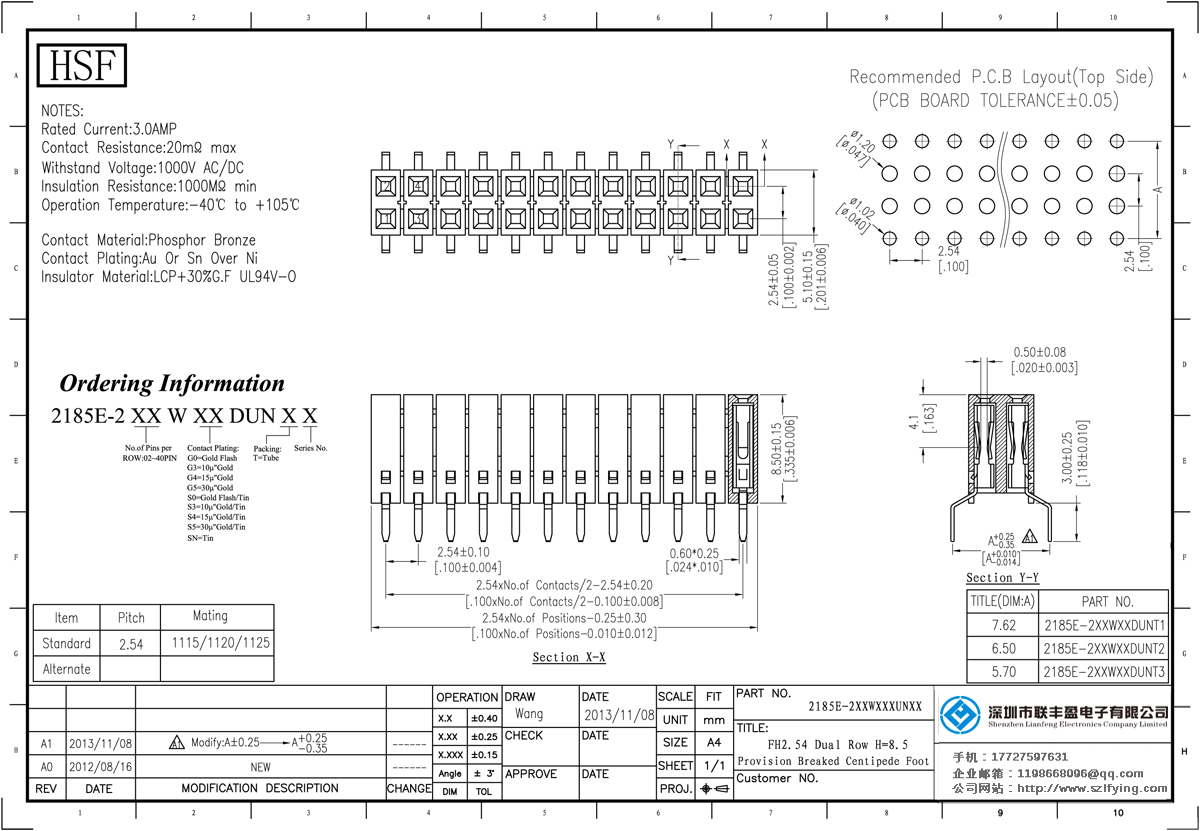 產品分類:排母連接器 產品規格:UL認證 2.54MM H=8.5MM 雙排 蜈蚣腳 排母 聯豐盈 產品介紹:額定電流:3.0amp電流電阻:20m最大絕緣電阻:1000mmin耐壓:1000V AC /分鐘工作溫度:40﹣℃+ 105℃