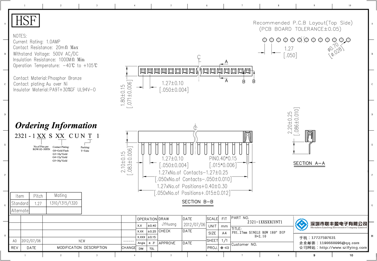 產品介紹:額定電流:1.0amp電流電阻:20mΩ最大絕緣電阻:1000mΩ民承受電壓:AC 500V /分鐘工作溫度:55﹣℃+ 105℃接觸材料:磷青銅接觸電鍍:對鎳金絕緣體材料:聚酯(UL94V-O)標準:PA6T或PA9T黑+ 30% GF HTPP/www.huifng-china.com