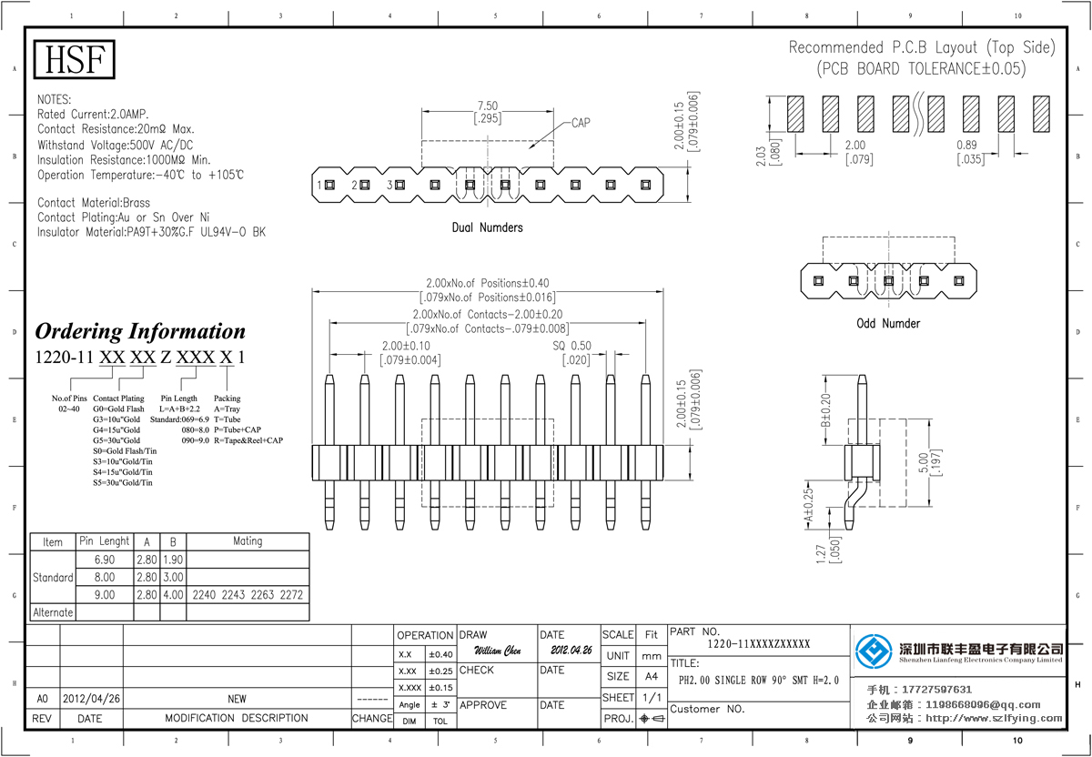 產品規格:聯豐盈 2.0MM 單層單排 90°SMT 排針 供應