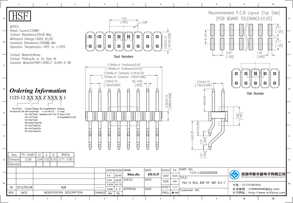 產品介紹:額定電流:3.0amp電流電阻:20mΩ最大絕緣電阻:1000mΩ民承受電壓:AC 500V /分鐘工作溫度:40﹣℃+ 105℃接觸材料:黃銅觸點電鍍金或錫鎳絕緣體材質:聚酯(UL94V-0)標準:PA9T或PBT黑色+ 30% GF