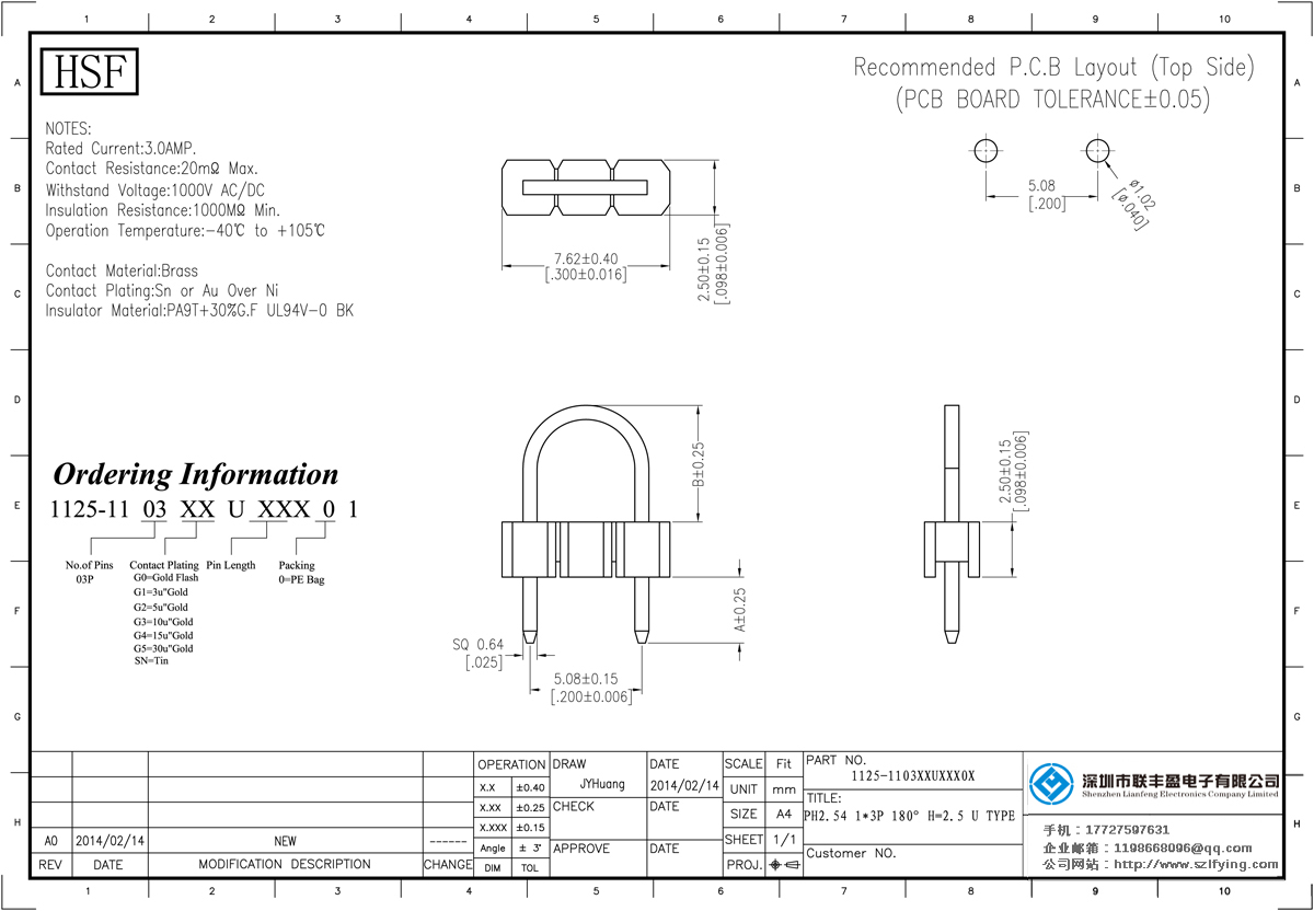 產品分類:排針連接器 產品規格:2.54MM 單層單排 U型DIP 排針 聯豐盈 產品介紹:額定電流:3.0amp電流電阻:20m最大絕緣電阻:1000m民承受電壓:AC 500V /分鐘工作溫度:40﹣℃+ 105℃接觸材