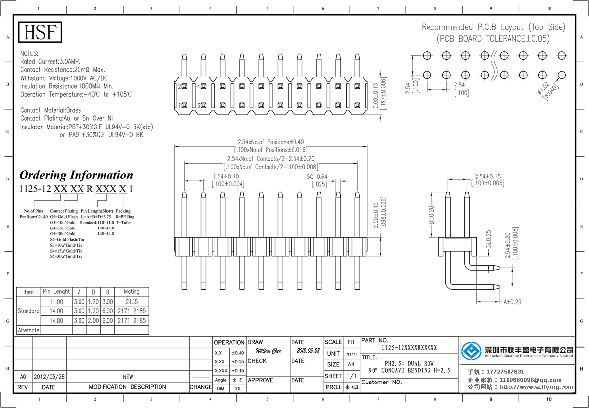 產品介紹:額定電流:3.0amp電流電阻:20mΩ最大絕緣電阻:1000mΩ民承受電壓:AC 500V /分鐘工作溫度:40﹣℃+ 105℃接觸材料:黃銅觸點電鍍金或錫鎳絕緣體材質:聚酯(UL94V-0)標準:PA9T或PBT黑色+ 30% GF