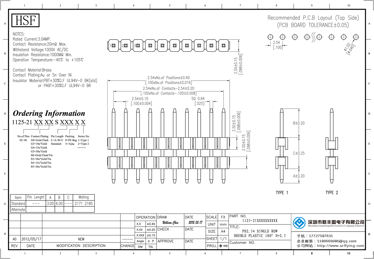 產品介紹:額定電流:3.0amp電流電阻:20mΩ最大絕緣電阻:1000mΩ民承受電壓:AC 500V /分鐘工作溫度:40﹣℃+ 105℃接觸材料:黃銅觸點電鍍金或錫鎳絕緣體材質:聚酯(UL94V-0)標準:PA9T或PBT黑色+ 30% GF