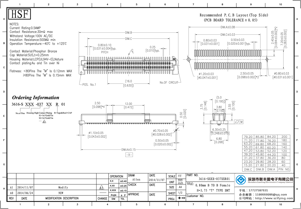 產(chǎn)品分類:Board To Board 連接器 產(chǎn)品型號:0.8MM 母頭T型 Board To Board 生產(chǎn) 聯(lián)豐盈 技術(shù)參數(shù):額定電流:0.5amp電流電阻:30m最大絕緣電阻:100m承受電壓:AC 500V /分鐘工作溫度:40﹣℃+ 10