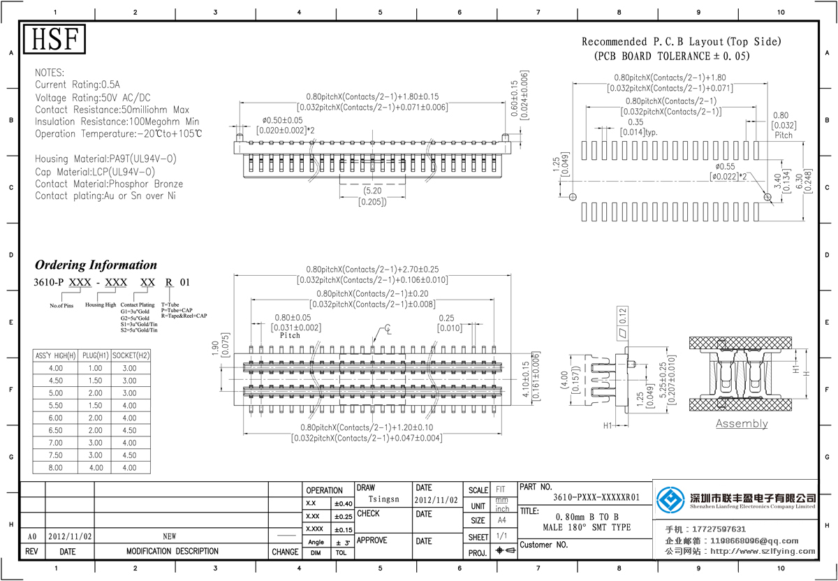 產品分類:Board To Board 連接器 產品型號:0.8MM 公座Board To Board 聯豐盈 技術參數:額定電流:0.5amp電流電阻:60m最大絕緣電阻:100m民承受電壓:AC 500V /分鐘工作溫度:40﹣℃+ 105℃接觸材